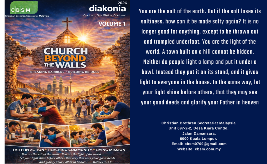 Diakonia 2026 vol 1 MESSAGES CBSM Chairman’s Message From the General Secretary’s Desk Editor’s Note FEATURES Church Beyond the Walls Here I am, Lord : A Mission Beyond the Walls The Christian Brethren National Mission Conference 2026: The Great Commission for All (GC 4 All) Students Learning and Support Programme (SLS) Dagon Brethren Assembly, Yangon